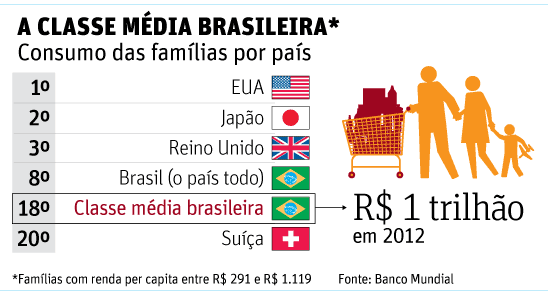 A classe média brasileira deve movimentar neste ano R$ 1 trilhão, segundo estimativas do governo. São 104 milhões de brasileiros, ou 53% da população total do país. Há dez anos, eram 38%.
